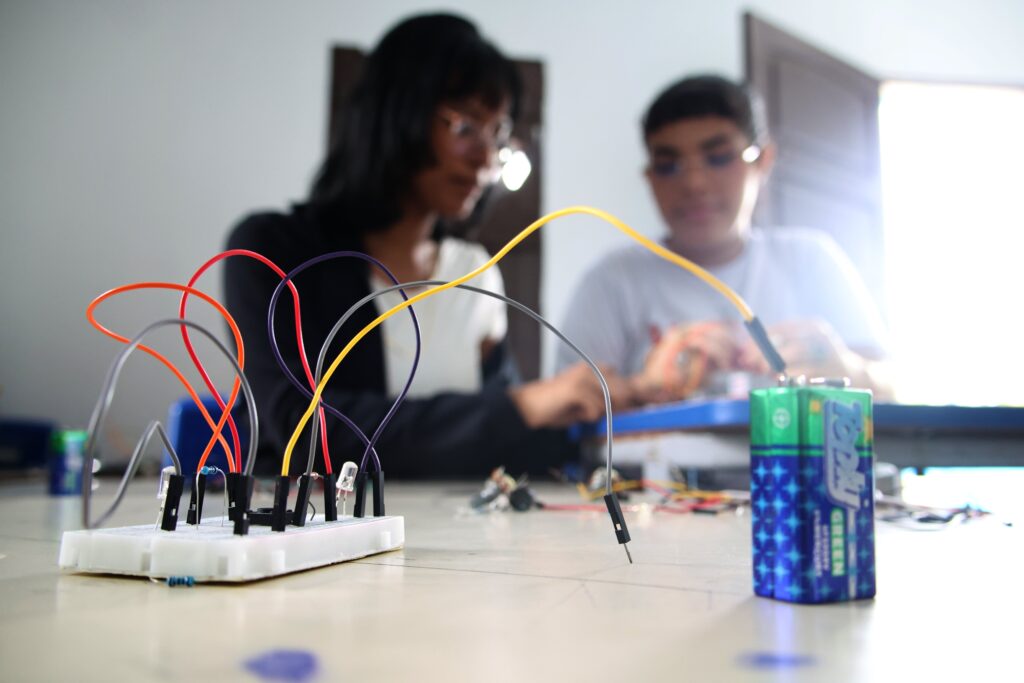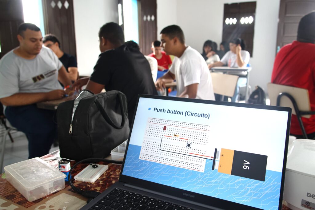 No curso de Robótica, os estudantes têm contato inicial com conceitos fundamentais da área. De acordo com Ygira Silva, professor do Empreende Cidadão, as primeiras aulas trabalham a robótica educacional de forma analógica, com o uso de botões e LEDs, permitindo que os alunos compreendam, na prática, o funcionamento de circuitos eletrônicos.