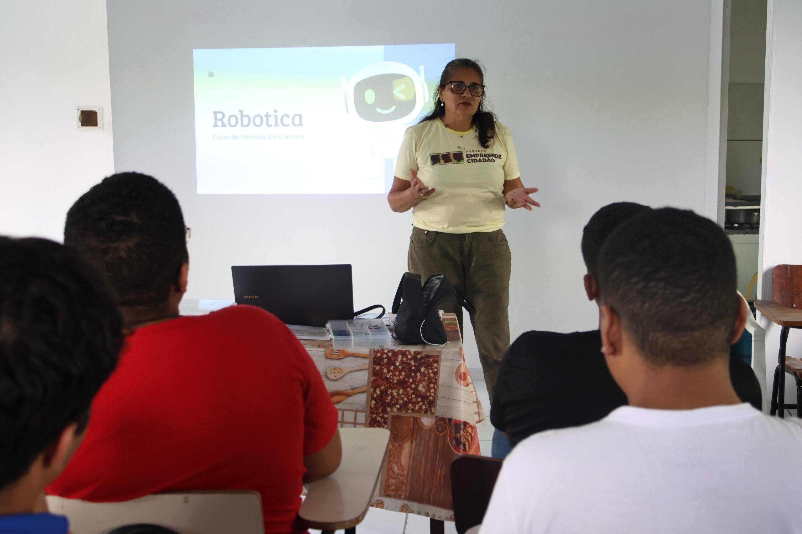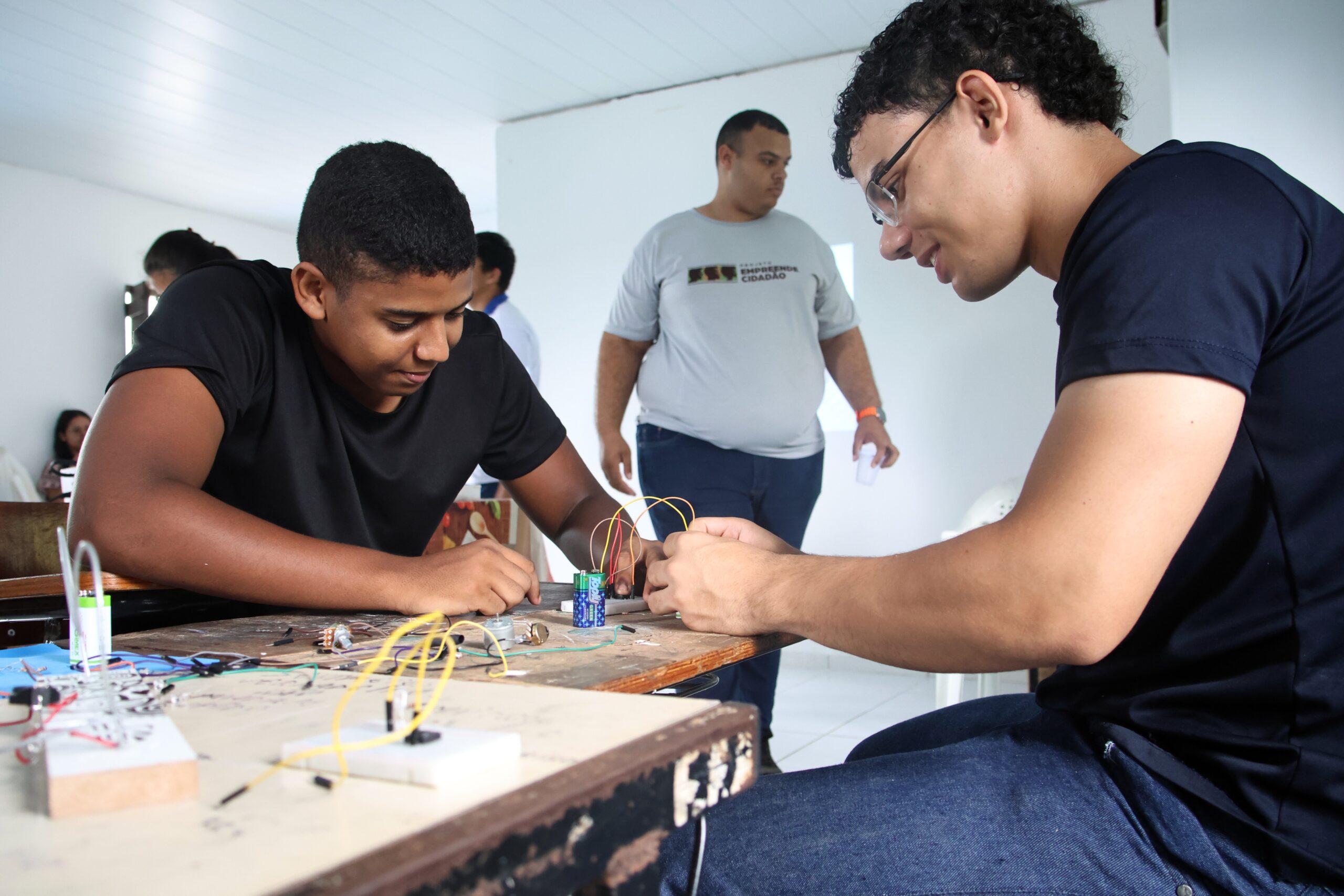 No curso de Robótica, os estudantes têm contato inicial com conceitos fundamentais da área. De acordo com Ygira Silva, professor do Empreende Cidadão, as primeiras aulas trabalham a robótica educacional de forma analógica, com o uso de botões e LEDs, permitindo que os alunos compreendam, na prática, o funcionamento de circuitos eletrônicos.