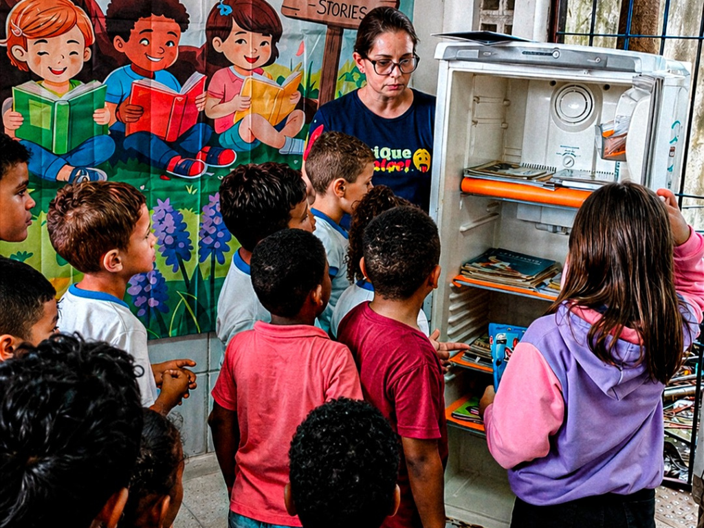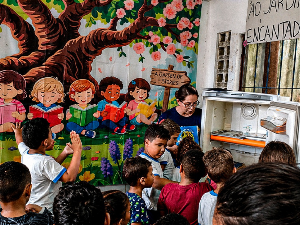 O espaço foi adaptado e customizado para funcionar como um ponto de leitura acessível, onde os alunos podem pegar, trocar ou doar livros. A proposta alia educação e consciência ambiental ao reutilizar um eletrodoméstico que seria descartado, conferindo a ele uma nova função social.