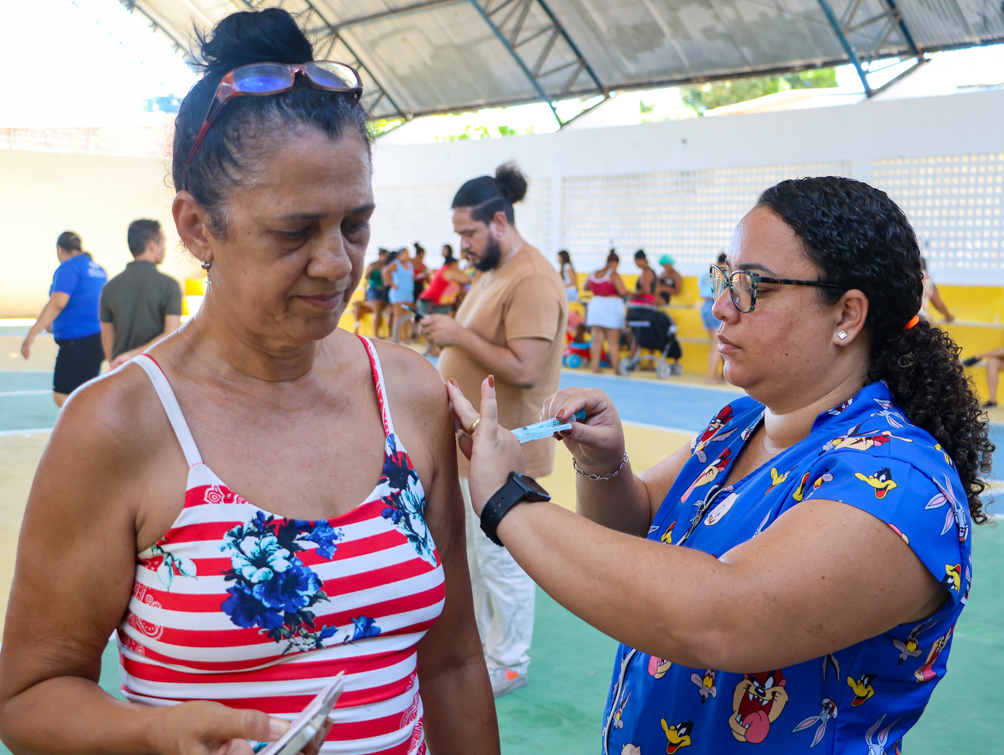 Além dos serviços ofertados na quadra do Tururu, na área externa, a Prefeitura do Paulista e o Governo do Estado de Pernambuco levaram duas carretas de atendimento. O veículo da prefeitura realizou exames de prevenção do câncer de colo do útero, enquanto a unidade móvel do Estado ofereceu acolhimento e orientação às mulheres.